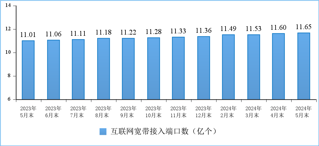 千兆光纤宽带网络建设持续推进。截至 5 月末,全国互联网宽带接入端口数量达 11.65 亿个,比上年末净增 2943 万个。其中,光纤接入(FTTH/O)端口达到 11.26 亿个,比上年末净增 3123 万个, 占互联网宽带接入端口的 96.6%。截至 5 月末,具备千兆网络服务能力的 10G PON 端口数达 2541 万个,比上年末净增 238.8 万个。