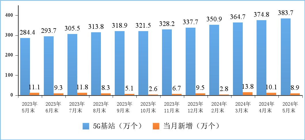 5G 网络建设稳步推进。截至 5 月末,5G 基站总数达 383.7 万个,比上年末净增 46 万个,占移动基站总数的 32.4%,占比较 1—4 月份提高 0.7 个百分点。