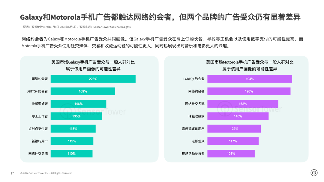 网络约会者为Galaxy和摩托罗拉手机广告受众共同画像。但Galaxy手机广告受众在网上订购快餐、寻找零工机会以及使用数字支付的可能性更高,而摩托罗拉手机广告受众使用社交媒体、交易和收藏运动鞋的可能性更大,同时也展现出对音乐和电影更大的兴趣。