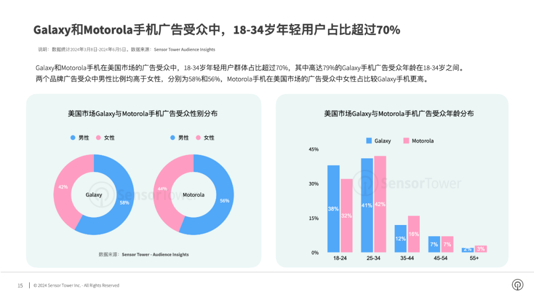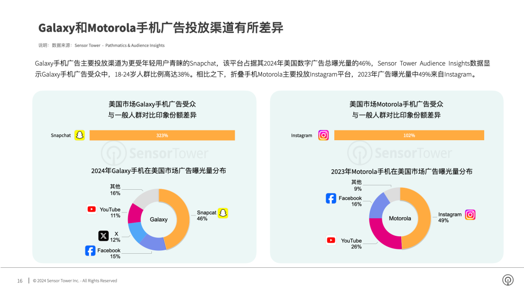 相比之下,摩托罗拉手机主要投放Instagram平台,2023年广告曝光量中49%来自Instagram,其广告受众中女性比例较Galaxy手机更高。