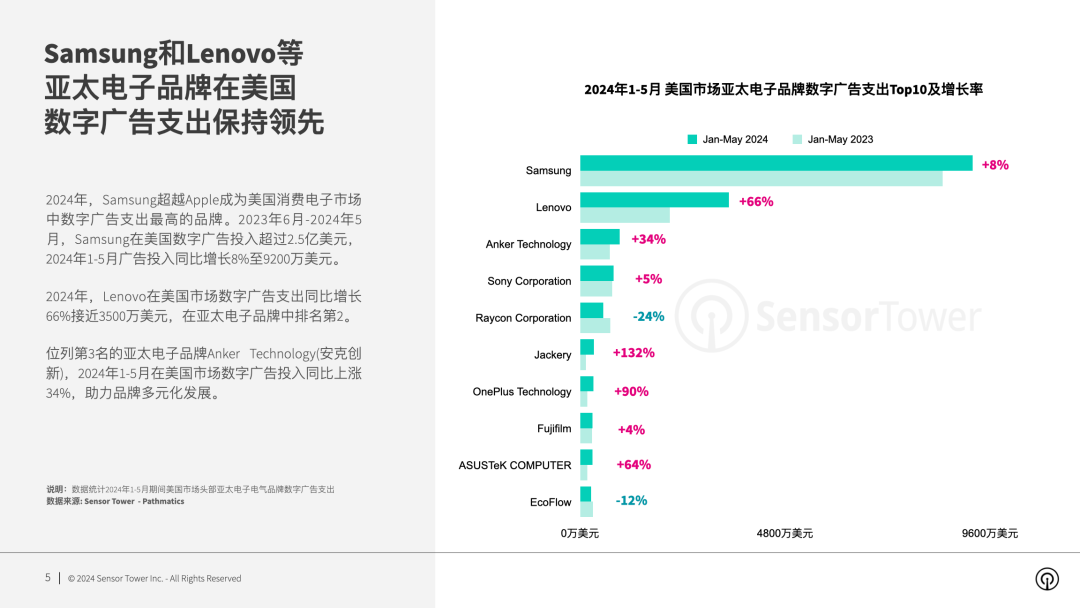 2024年联想(Lenovo)在美国数字广告支出同比增长66%接近3500万美元,在亚太电子品牌中排名第2。位列第3名的亚太电子品牌安克创新(Anker Technology),2024年1-5月在美国数字广告投入同比上涨34%,助力品牌多元化发展。