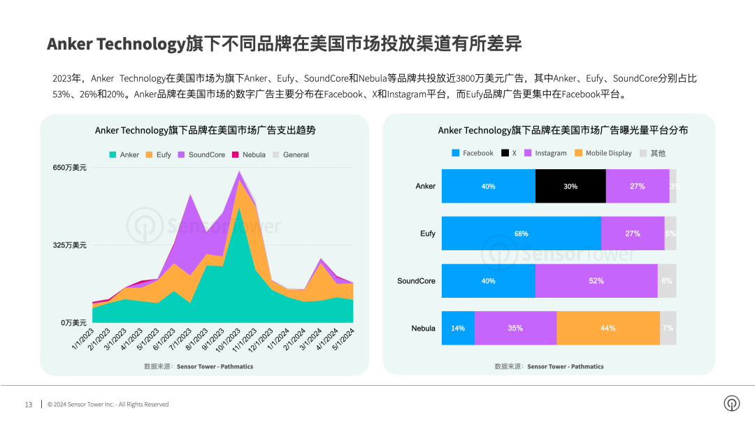 2023年安克创新在美国市场为旗下Anker、Eufy、SoundCore和Nebula等品牌共投放3800万美元广告,Anker、Eufy、SoundCore分别占比53%、26%和20%。Anker品牌在美国市场的数字广告主要分布在Facebook、X(原Twitter)和Instagram平台,而Eufy品牌广告更集中在Facebook平台。