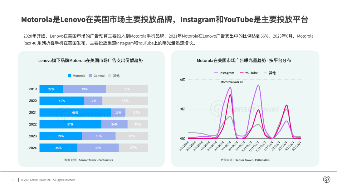 2020年开始,联想在美国市场的广告预算主要投入到摩托罗拉(Motorola)手机品牌。2023年6月,摩托罗拉折叠手机Razr 40系列在美国发布,主要投放渠道Instagram和YouTube上的曝光量迅速增长。