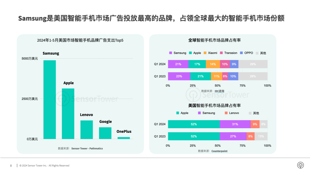 在全球智能手机市场,2024年Q1 三星手机拥有最大的市场份额(数据来源: IDC咨询),其美国市场份额也从2023年Q1的27%提升至2024年Q1的31%(数据来源: Counterpoint Research)。2024年1-5月,三星在智能手机市场广告投入同比提升16%至5000万美元,助力三星手机在美国市场的扩张。