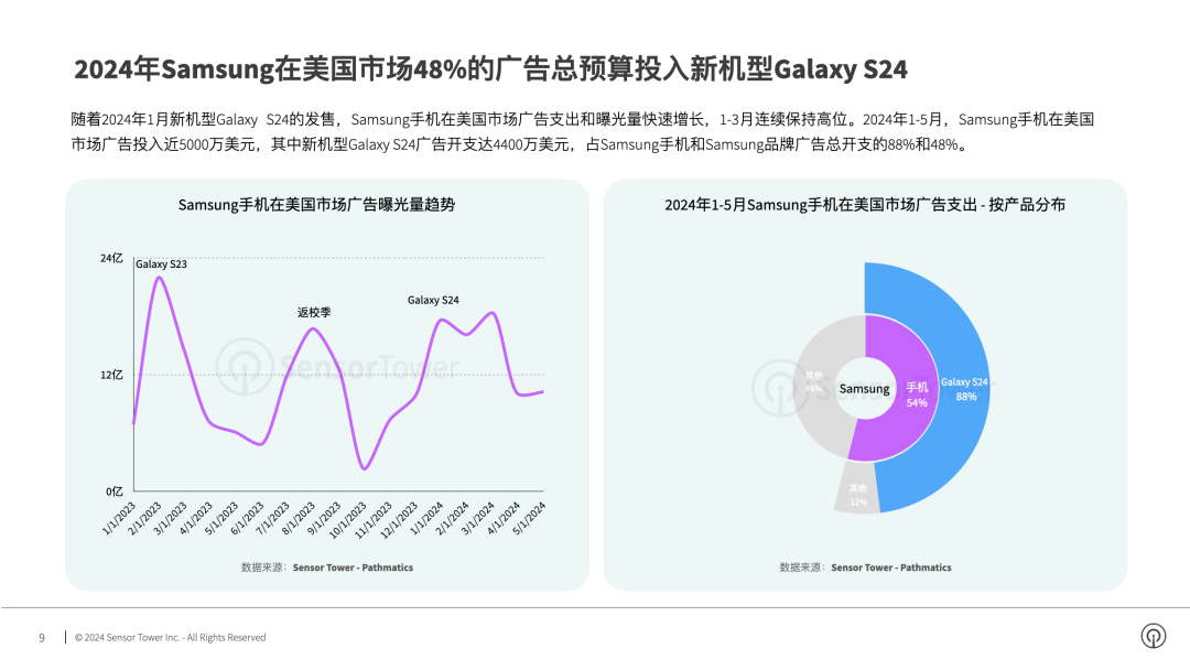 2024年1-5月,新机型Galaxy S24广告开支达4400万美元,占三星手机和三星品牌广告总开支的88%和48%。