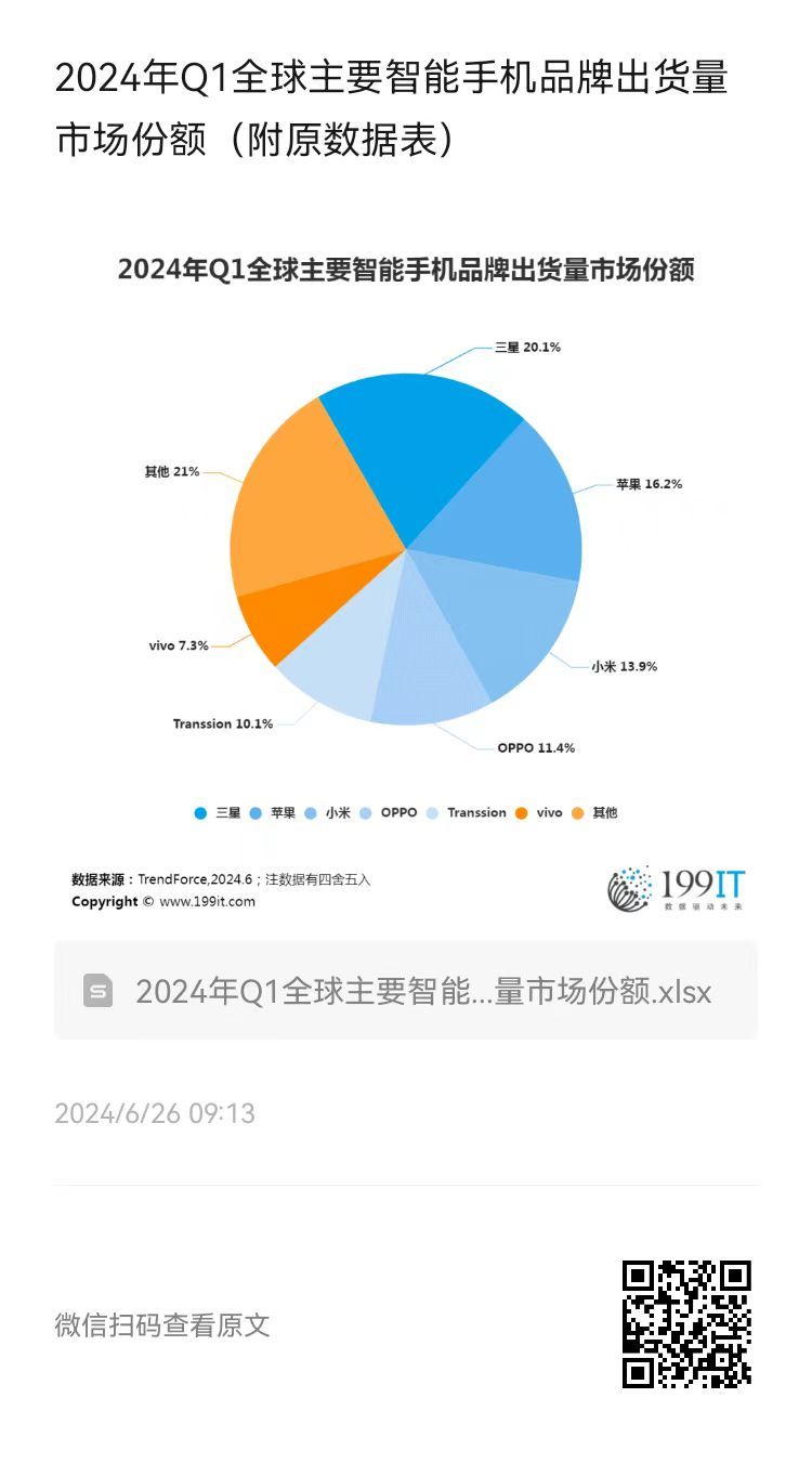 - 2024年Q1全球主要智能手机品牌出货量及环比(附原数据表)