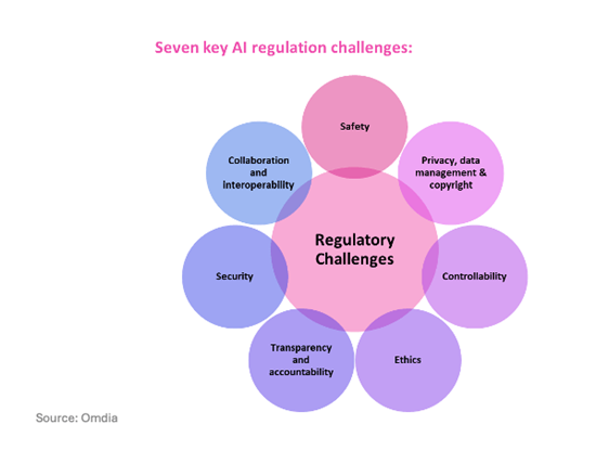 Omdia 的报告指出了监管机构必须应对的七大挑战,以确保人工智能发展带来的众多机遇得以实现,其中包括:安全性、隐私、道德、可控性、透明度和问责制、安全性以及版权和知识产权法。监管机构已经开始着手解决其中的一些问题,迄今为止发布的大多数指导方针都非常关注与人工智能实施相关的道德和法律问题,但预计明年这一进程只会加快,因为监管机构将重点关注特定行业的法律以及人工智能应用与现有监管政策之间可能存在利益冲突的领域,如数据保护法、版权法、过时的用户同意方法、许可协议或许可证以及特定行业的法律。