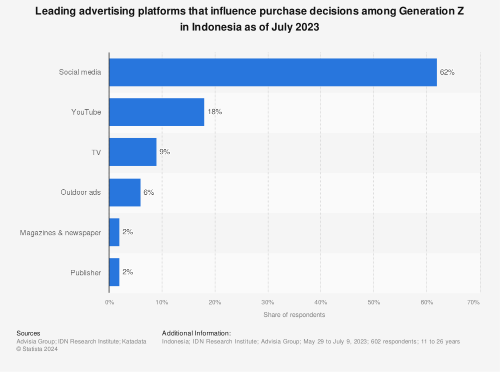 截至2023年7月,影响印尼Z世代购买决策的领先广告平台。数据来源:Statista.com
