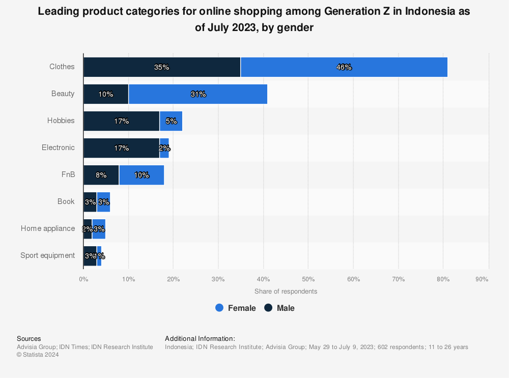 截至2023年7月,印尼Z世代在线购物的主要产品类别(按性别划分)。