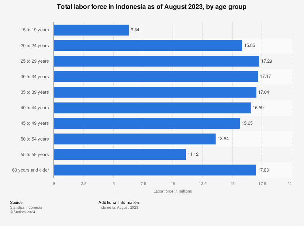 截至2023年8月,印尼按年龄组划分的总劳动力。数据来源:Statista.com