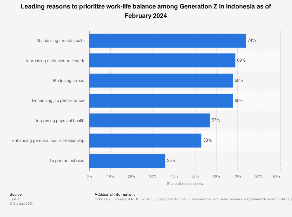 截至2024年2月,印尼Z世代优先考虑工作与生活平衡的主要原因。数据来源:Statista.com