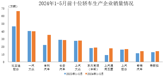 中汽协:2024年1-5月前十位轿车生产企业销售情况简析 据中国汽车工业协会统计分析,2024年1-5月,销量排名前十位的轿车生产企业共销售280.6万辆,占轿车销售总量的67.6%。 在上述十家企业中,与上年同期相比,除一汽大众和长安汽车销量微降外,其他企业销量均呈不同程度增长。 更多阅读:中国汽车工业协会:2022年1月前十位轿车生产企业销售情况简析中国汽车工业协会:2023年1-8月前十位轿车生产企业销售情况简析中国汽车流通协会:2020年4月中国进口汽车市场月报2020年1月份京城汽车市场分析中国汽车流通协会:2020年3月份国内狭义乘用车市场销量达104.5万辆 同比下降40.4%中国汽车工业协会:2023年1-2月我国汽车商品出口金额前十国情况简析中国汽车工业协会:2022年3月前十位轿车品牌销量排名中国汽车工业协会:2021年5月汽车工业运行情况简述中国汽车流通协会:2022年4月中国汽车保值率报告中国汽车流通协会:2020年第一季度豪华品牌新增授权4s店57家 退网4s店41家商务部:2020年1-5月我国汽车出口37.3万辆中国汽车流通协会:2024年6月中国进口汽车市场情况中国汽车工业协会:2024年6月海关进出口情况简析乘联分会:2024年7月新能源乘用车厂商批发销量快讯中国汽车流通协会:2024年6月全国二手车市场深度分析