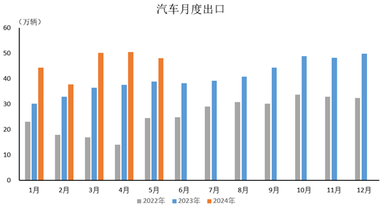 2024年5月,汽车出口48.1万辆,环比下降4.4%,同比增长23.9%。