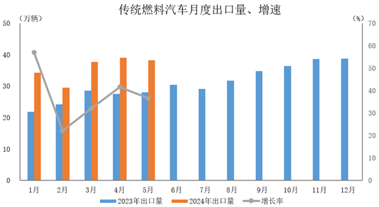 2024年5月,传统燃料汽车出口38.3万辆,环比下降1.8%,同比增长36.6%。