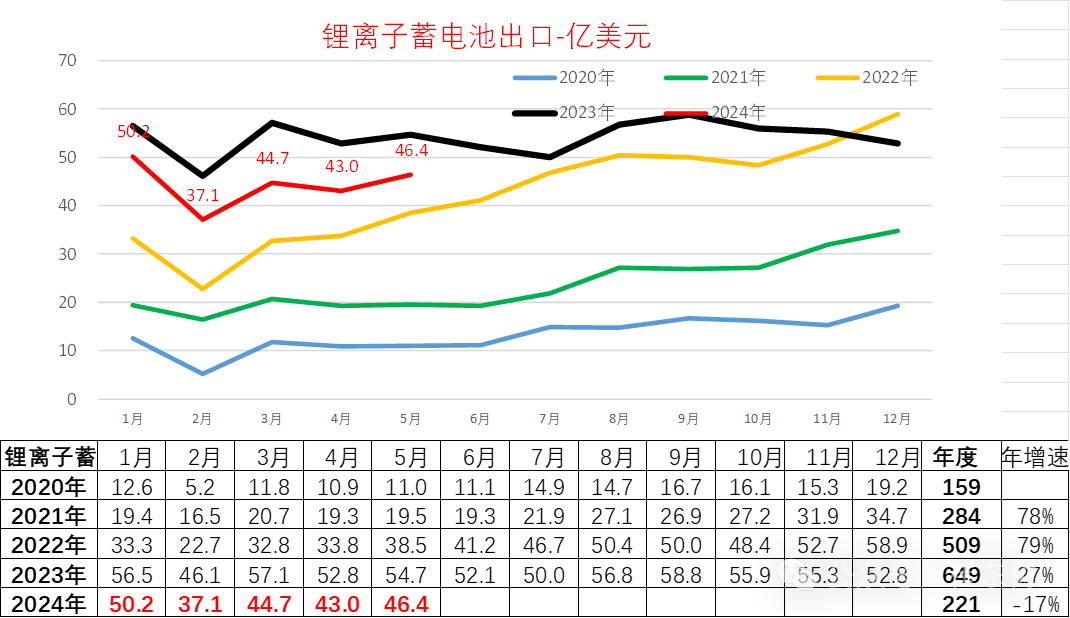 2024年1-5月中国锂电池出口221亿美元降17%,而今年1-5月锂电池出口数量增长4%。主要出口单价出现剧烈的下滑22%,带来出口额的下降。