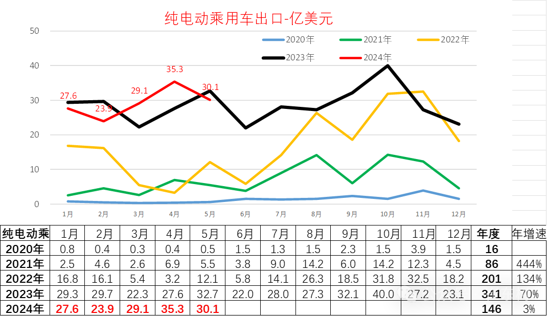 2024年1-5月中国纯电动新能源车出口146亿美元增3%。1-2月出口走势平缓,但3-4月迅速拉升,体现了自主车企出口的新动力,5月新能源车出口受到欧盟的调查因素而不强。