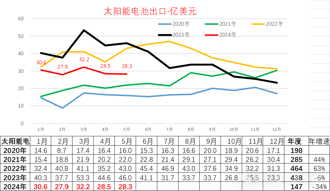 1-5月中国太阳能电池出口147亿美元降34%,而今年1-5月太阳能电池出口数量按个数增长25.9%。主要出口单价出现剧烈的近46%的下滑幅度,带来出口额的下滑34%。