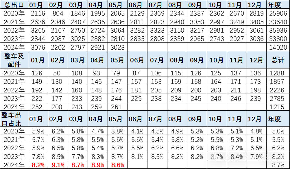 2024年1-5月中国汽车整车和配件出口1215亿美元,占中国贸易出口14020亿美元总额的8.7%,目前已经超过手机和笔记本的出口规模,但较家电耐用消费品的总体出口仍是偏低的。