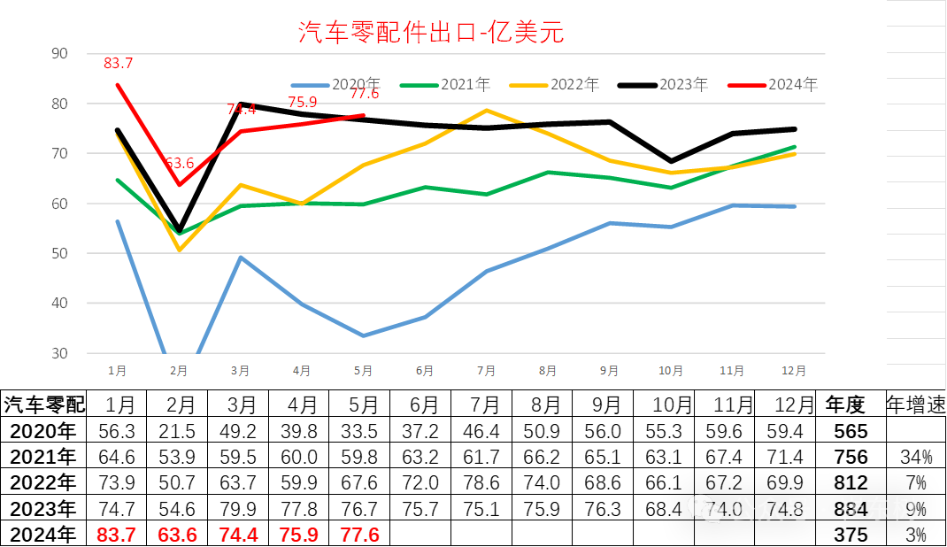 2024年1-5月中国汽车配件出口375亿美元增3%。今年1-2月汽车零部件出口较好,虽然3-4月出现一定的负增长,这也是较少见的走势,体现了海外汽车产业链总体生产需求不佳,5月的汽车零部件出口恢复态势较好。