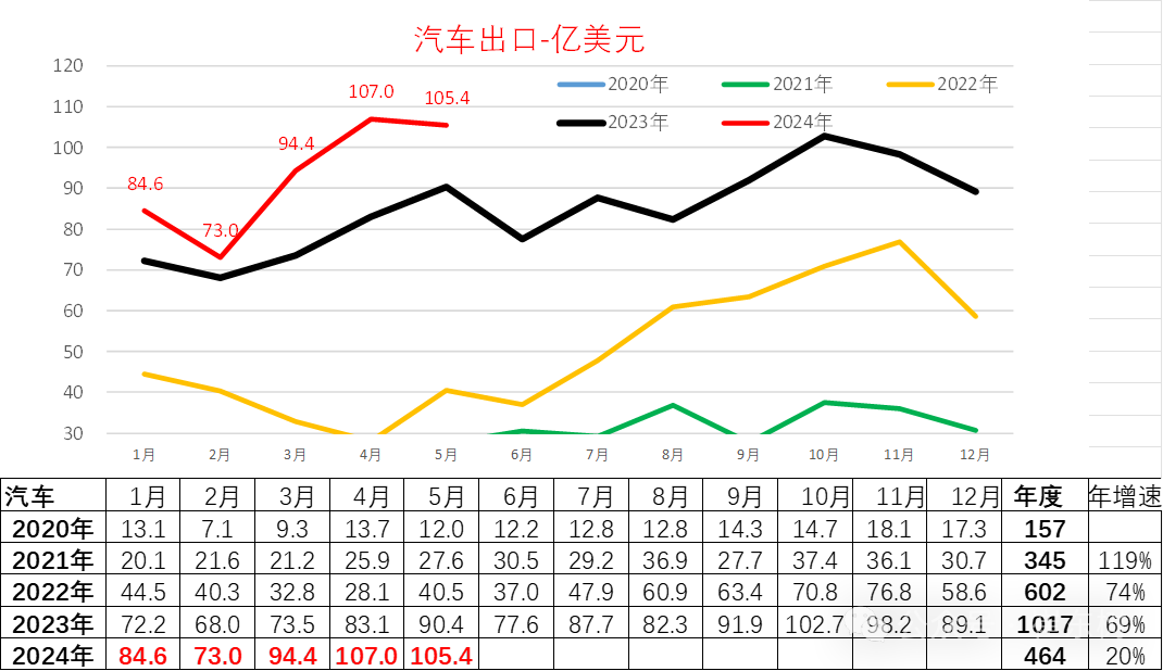 2024年1-5月中国汽车整车出口464亿美元增20%,走势持续超强,没有出现出口额的负增长压力。