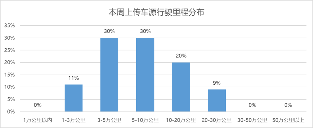 从上传车源行驶里程数据来看,本周上传数据中,各个区间的上报数据分析情况均与上周保持一致。