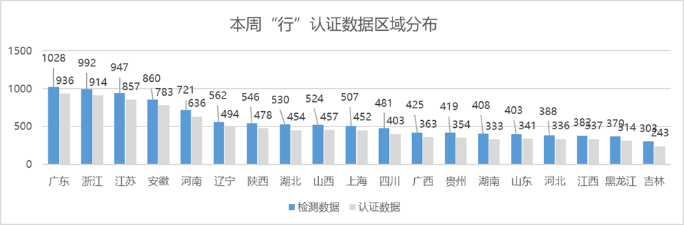 2024年6月第三周,上报 “行”认证统计数据中基于国家标准检测车辆为10796台,其中符合“行”认证数据为9485台(占比约88%),符合团标数据为6233台(占比约58%),本周上报数据上周数据基本持平(微增12台),较2023年同期环比增长约1%,车况数据质量与上周表现基本持平。
