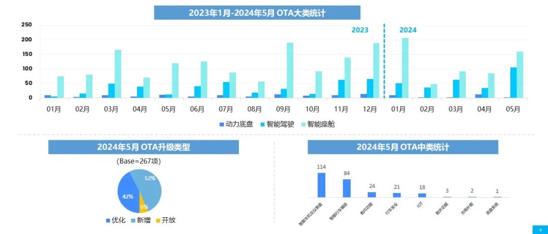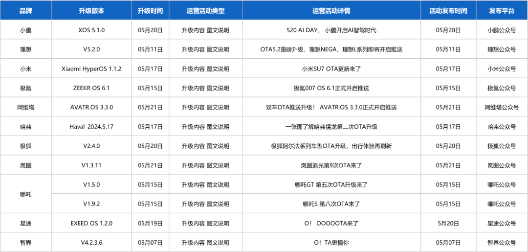 新势力共计更新267项内容(上月130项),与上月相比显著上升。以往车企都会在重大节假日前一月密集推送升级,5月和6月有劳动节和端午节两个重要的公众假期,因此4月和5月均有密集推送。
