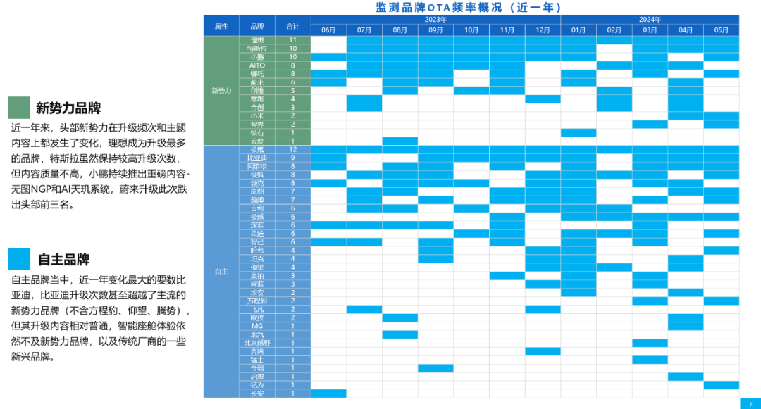 自主品牌共计更新315项内容(上月147项),较上月显著上升。除了有升级一贯积极的传统厂商新兴品牌以外,长城系、比亚迪等传统品牌也推送了OTA升级。