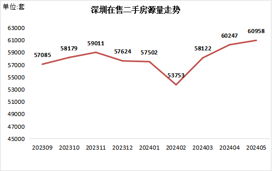 截至2024年6月1日,根据深圳市房地产信息平台公开在售二手房数量统计,全市有效在售二手房源60,958套,对比5月1日统计的60,247套在售房源增加711套(如下图),环比增长1.2%。从月度走势看,市场二手房在售量呈现持续增长态势,近期随着楼市优化政策的陆续发布,市场活跃度有所提升,对应的业主委托出售意愿也在提升。