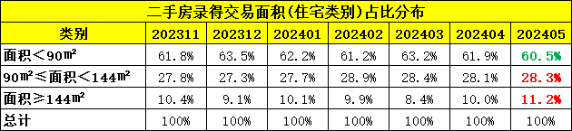 据统计,5月市场成交小于90平方米的房源占总量60.5%,较上月再次下降1.4个百分点,而大于144平方米的房源占总量11.2%,较上月提升1.2个百分点,反映出改善型客户成交意愿及活跃度上升。