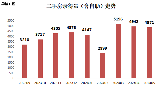 根据深房中协统计,2024年5月全市二手房录得【本文录得量系指深房中协以二手房买卖合同发起时间为口径统计的数据,并非最终成交过户套数】4,871套,环比下降1.4%,同比增长35.2%。环比下降分析主要原因是五一假期消费者出游,录得量较少,若剔除五一假期因素,5月6日至31日日均录得量较4月日均增长10%。