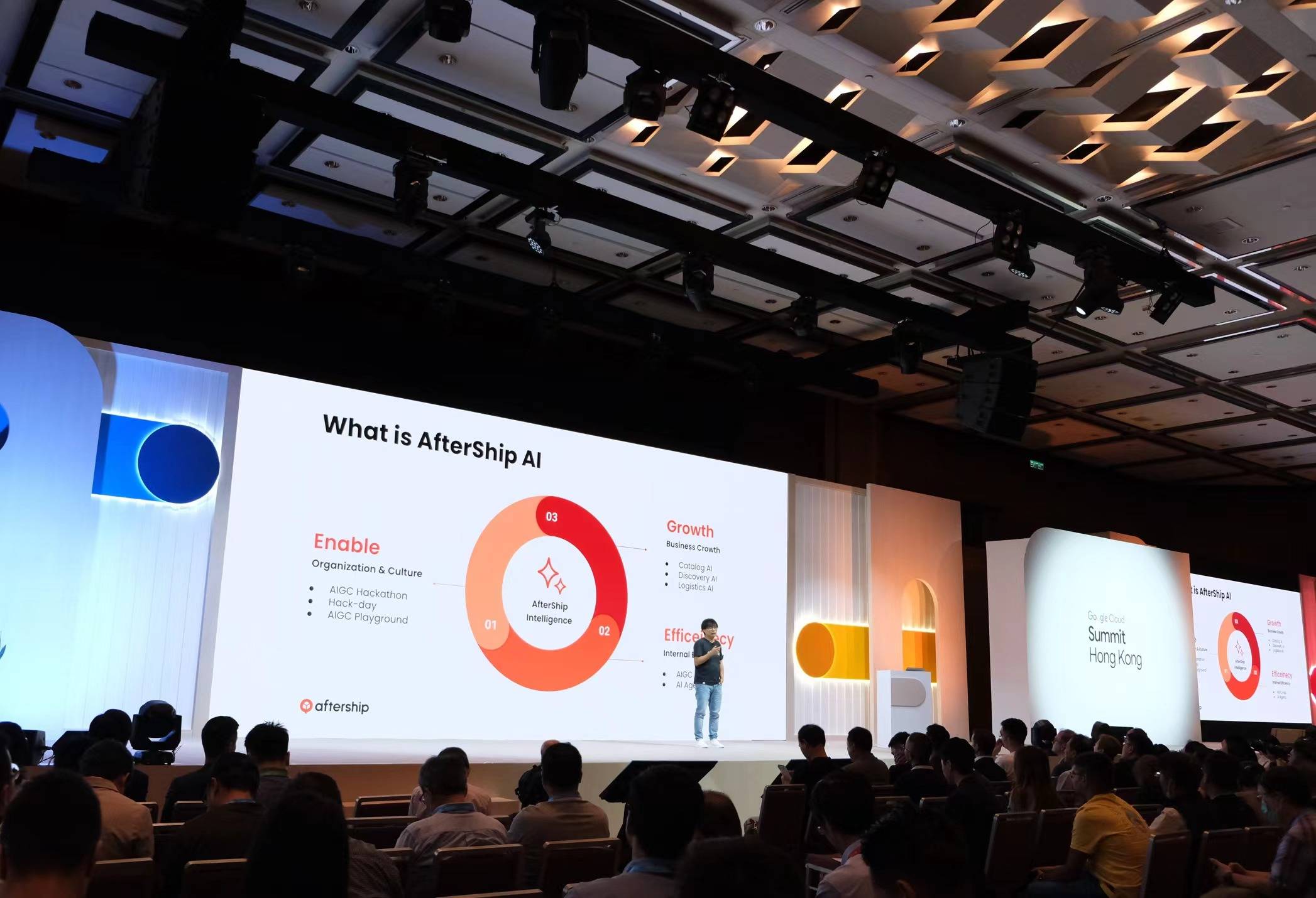 在峰会上,AfterShip 的 CTO James Hong 和数据总监 Harvey Pu 应 Google Cloud 邀请,分享了 AfterShip 如何激励全员拥抱 AIGC,并用 AI 提升内部效率和驱动业务增长的实践经验。