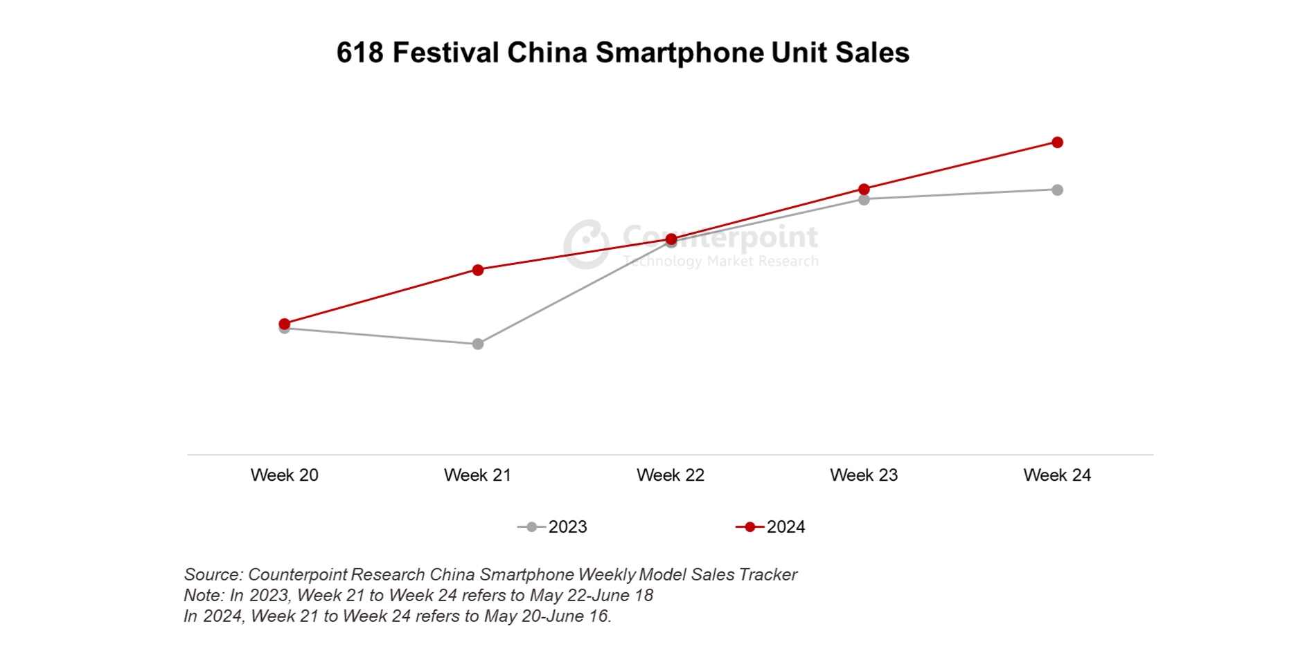 Counterpoint的最新数据显示,2024年第21周至第24周,也就是618购物节期间,中国智能手机销量同比增长6.8%。大多数原始设备制造商提供的价格折扣与去年类似,表明需求回暖。值得注意的是,今年的618从5月20日持续到6月20日,持续时间比以往更长,因为天猫的促销活动从5月20日开始。2023年618是从5月31日到6月18日。这一延长的促销期也促进了今年的增长。