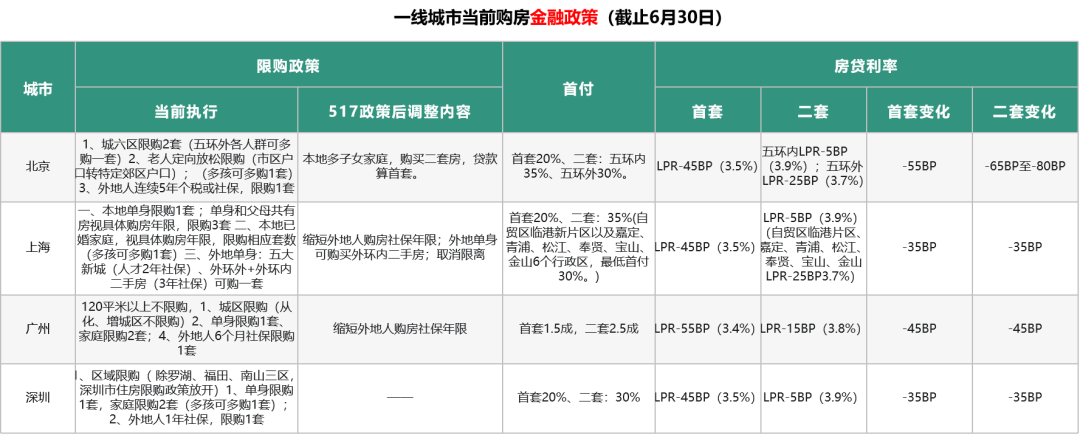 6月26日北京新政终于发布,至此,一线城市在517后的新一轮调整全部落地。此轮调整政策力度巨大,北京、上海、深圳的首套房最低首付比例统一降至20%,广州降至15%。首套房贷利率下限普遍调整为LPR减45个基点,二套房贷利率调整至LPR减5-25个基点,其中北京下调幅度最大,二套房贷利率下调幅度达65-80个基点。