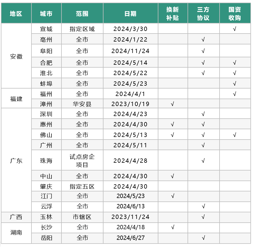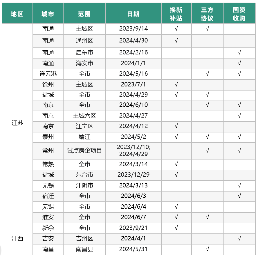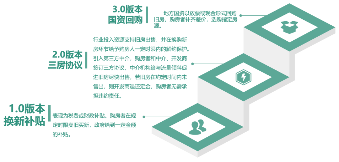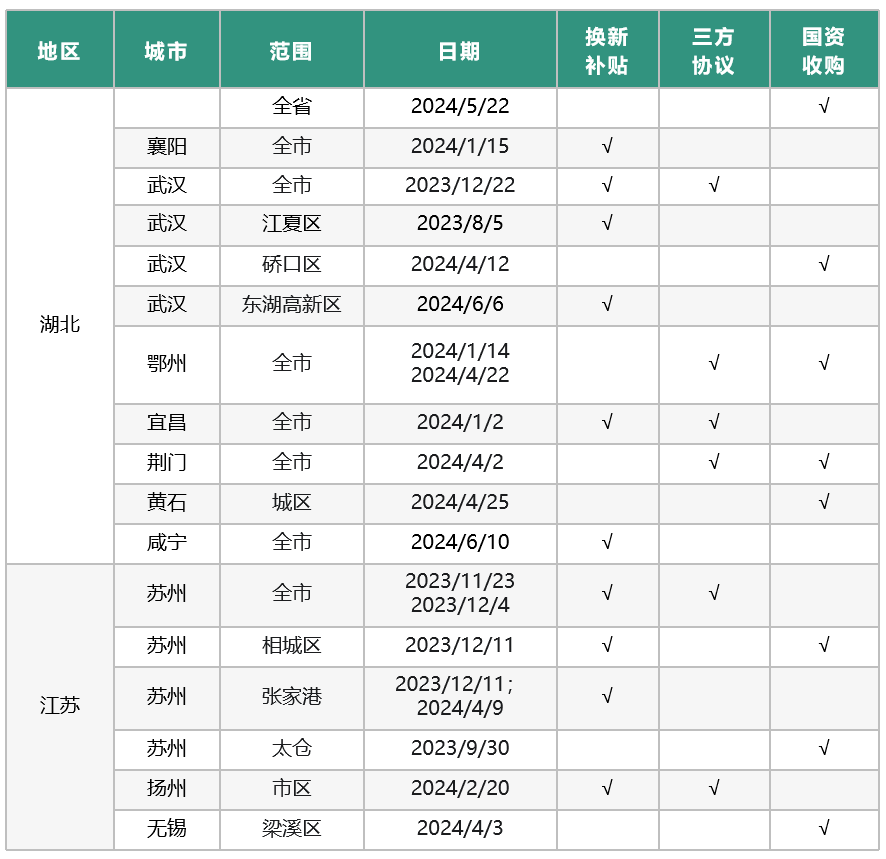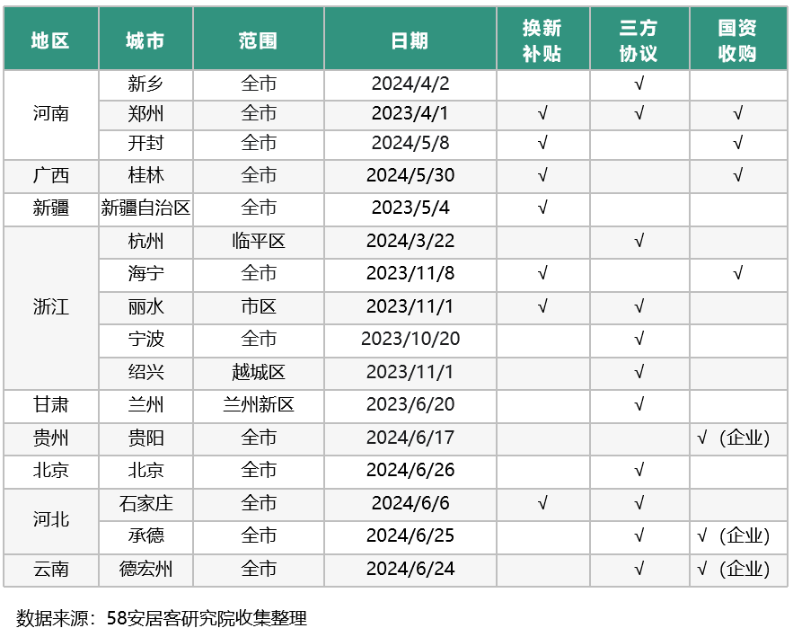 从换新方式上来看,今年5月份已有越来越多的城市鼓励国资进场,收购二手旧房用于保障房或者市场化租赁用途,部分城市已有落地的方案,如安徽宣城城市建设集团发布商品房以旧换新公告;硚口城市更新公司深度参与,购房者旧房由区国企进行收购等;南京市安居建设集团启动主城六区存量住房“以旧换新”试点等等。也有更多城市非国企收购换房人的旧房,拓宽新业态、发展新业务。但更多的城市依旧停留在“鼓励、支持”层面。