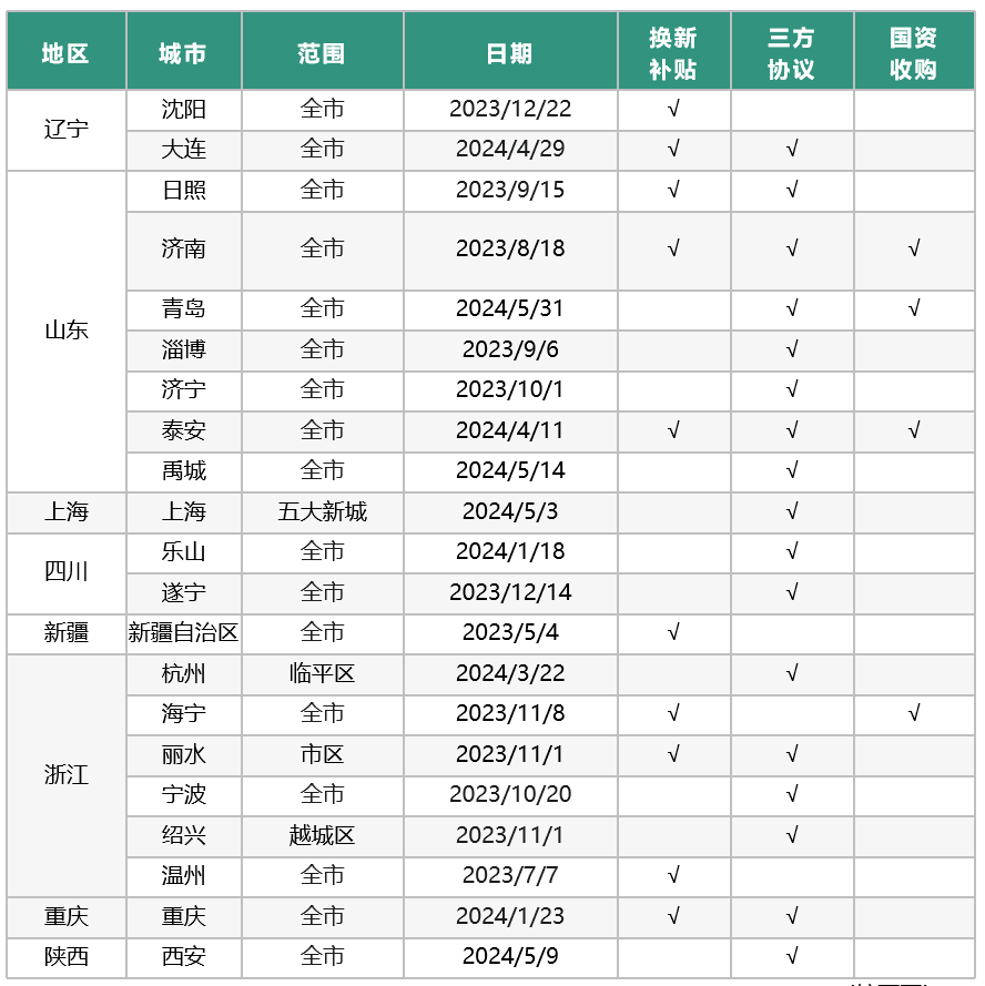 从城市数量上看,据不完全统计,至今,已有河北、江苏、山东、浙江、河南、四川、辽宁、安徽、湖北、福建、湖南、江西、广东、陕西、广西、甘肃、贵州、云南省内的80多个城市或者区域提出以旧换新政策,湖北则是省级发文推进住房“以旧换新”;直辖市中,上海、重庆“一马当先”。