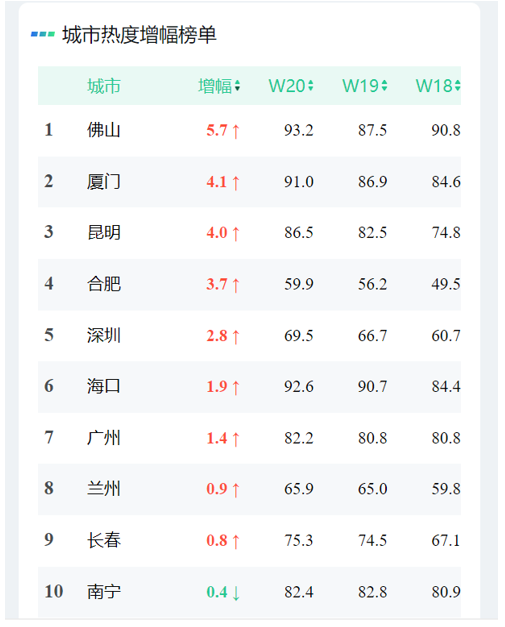 从20周的城市热度增幅榜单看,华南区域城市增幅显著,从增幅榜单前十项目看,有6个均来自华南区域,一线城市中是深圳、广州也在其列。值得注意的事,深圳在517新周末三天较前一周、以及五一假期的增幅均达38%,在各城市中居首,而厦门、海口、佛山、广州这些华南城市也清一色地表现领先,本周末较上周末的热度增幅都在2成以上。