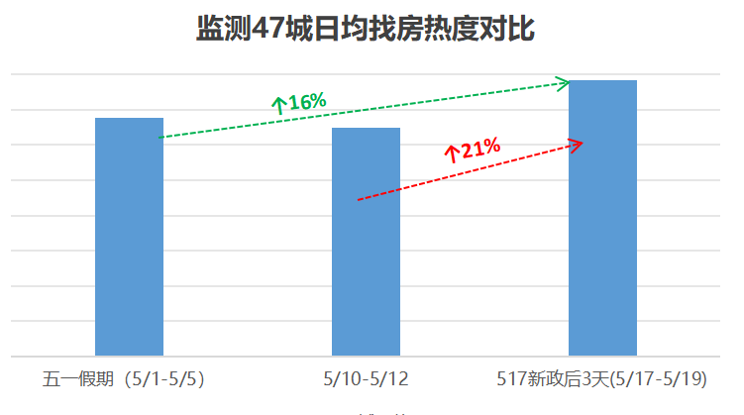 政策发布后的三天,即5月17-20日周末的这三天,监测47城的日均找房热度就比上一周高出21%,比五一假期还高出10%,找房热情出现明显提升。