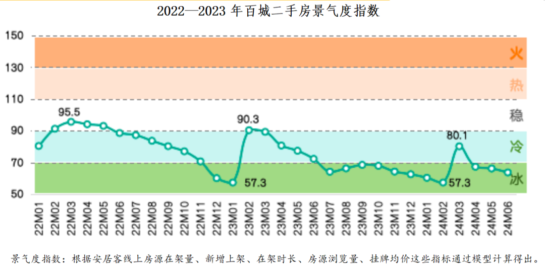 - 2022年楼市调整以来,整个二手房市场景气度指数的走势也是一浪低过一浪,尤其是进入了2024年,景气度指数在年后出现一波反弹之后直接再次回到冰点,整个上半年也基本上都在冰点范围内运行,可谓当前是整个二手房市场最艰难的时刻。