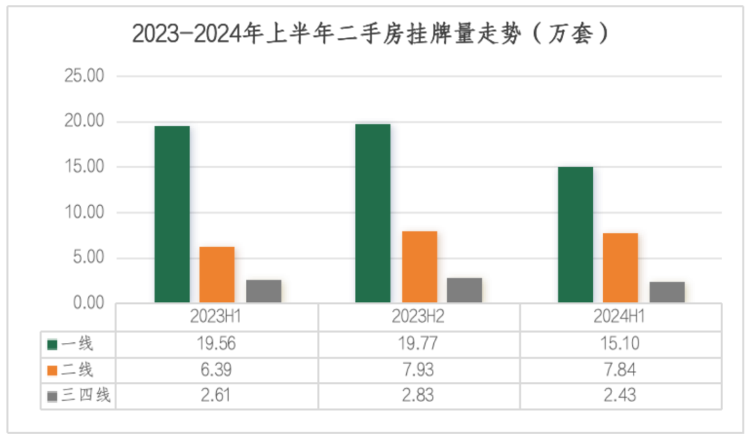 2024年上半年月均挂牌量同比出现一定分化,其中一线城市和三四线城市同比均出现回落,减幅为22.8%和6.6%,二线城市同比出现22.6%的增加。