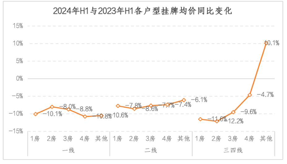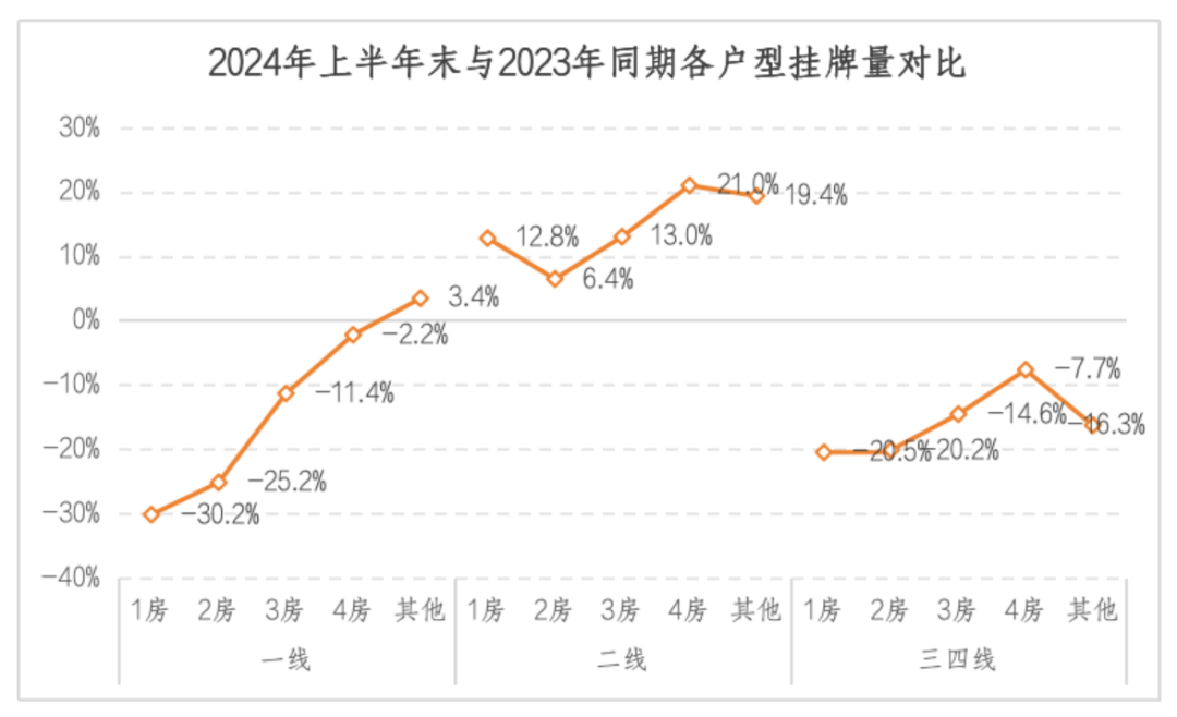 从各线2024年上半年末和2023年同期的挂牌量对比数据来看,一线城市各户型挂牌量同比呈现出面积越大,其挂牌房源减幅逐步降低的趋势,尤其是其他大户型房源在整体减少的情况下,反而出现增加的情况;二线城市2024年上半年期末挂牌量同比是出现增加的,其中2房的增幅相对最小,为6.4%,4房的增幅最大,为21.0%;三四线城市2024年上半年期末挂牌量同比呈现出和一线相似的走势,随着户型的增加,其挂牌房源减幅在逐渐缩小的态势,不过,三四线城市其他大户型房源同比却出现跌幅扩大的情况。