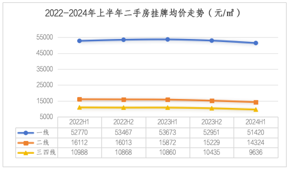 据58安居客研究院统计数据显示:2024年上半年,各线城市二手房挂牌均价同环比都出现了下跌,其中三四线城市的跌幅最大,环比下跌7.7%,同比下跌11.3%,并且其均价已跌至1万元/平方米以下的水平;二线城市的挂牌均价跌幅其次,环比下跌5.9%,同比下跌9.8%;一线城市的跌幅相对会略小,环比下跌2.9%,同比下跌4.2%。