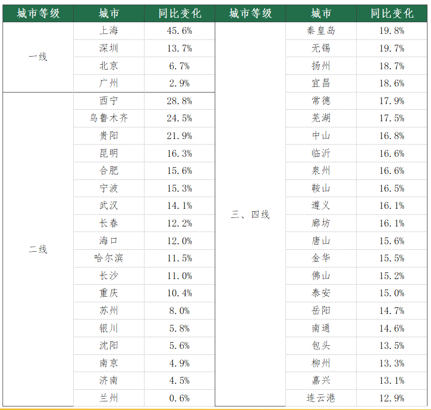 二手房挂牌时长的持续上升表明购房者当前购房的决心并不坚定,观望气氛浓郁的表现。一线城市体现得尤其突出,挂牌时长全部出现上涨,其中上海上涨了45%,是一线城市中涨幅最大。二线城市中,出现一定的分化,半数城市上涨,还有一半城市挂牌时长出现回落,其中杭州的跌幅最大,表明有经济基础的强二线城市还是能够在政策刺激之下带来一定的成交意愿。