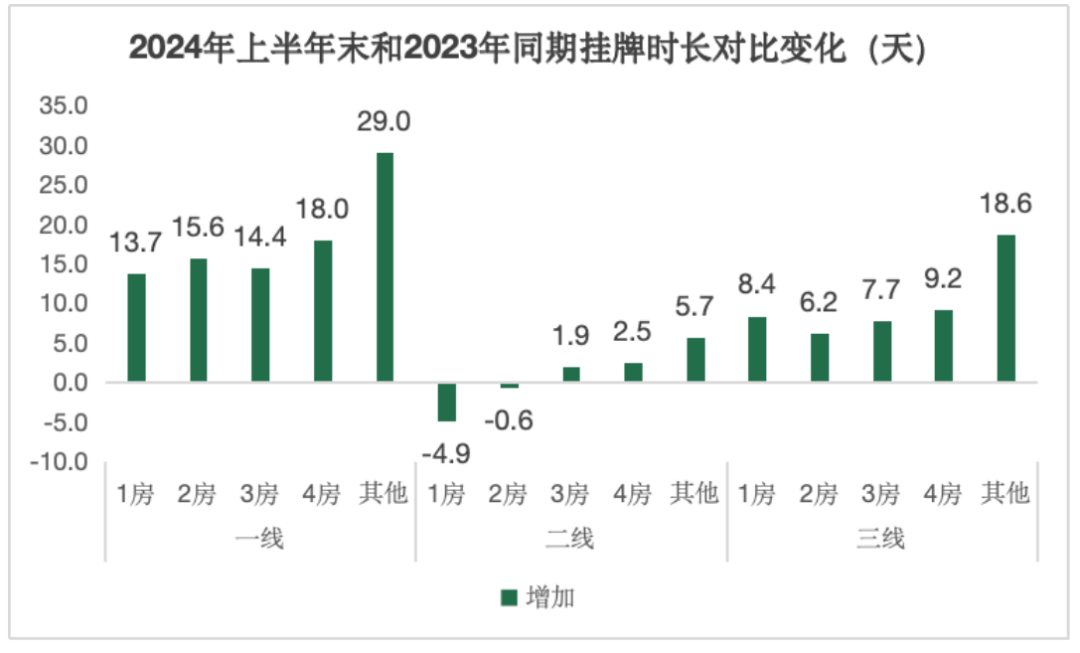 2024年上半年末,各线城市不同户型的二手房挂牌时长同比多出现了上涨的态势。其中,一线城市的上涨态势尤其明显,各户型挂牌时长同比都出现10天以上的增加,其他大户型的涨幅更是达到了29天。二线城市中,1房的挂牌时长同比出现小幅回落,2024年上半年末相比2023年同期减少了4.9天,2房也减少了0.6天,而其他房型的挂牌时长都出现了小幅上升。三四线城市2房的挂牌时长增加相对最小,而其他大户型的挂牌时长增幅最大。