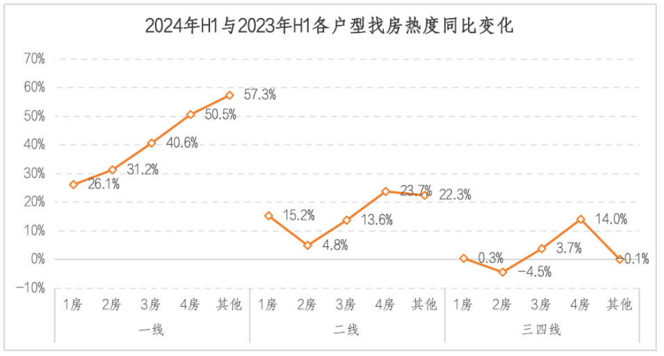 2024年上半年,一线城市找房热度呈现出随着户型越大,找房热度增幅越大的趋势,其中四房以上的户型找房热度增幅都超过了50%,大户型需求在今年更是得到购房者的关注。二线和三四线城市的表现趋同,1房的找房热度表现会好于2房,表明城市对住房的需求有最基本的刚需要求,或者就是追求一步到位的3房以上的需求,因此2房的找房热度表现相对会略差。