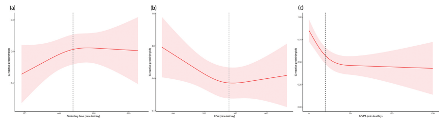 研究利用加权回归模型、两段线性回归模型等统计方法,来评估:中等到剧烈的体力活动(MVPA)、轻度体力活动(LPA)、久坐行为与慢性炎症(CRP)之间的关联。此外,研究人员还应用了等时替代模型来模拟用MVPA或LPA来缓解睡眠不足、久坐对CRP水平的影响,并且进行了量效分析,旨在发现降低CRP水平的物理活动强度阈值。