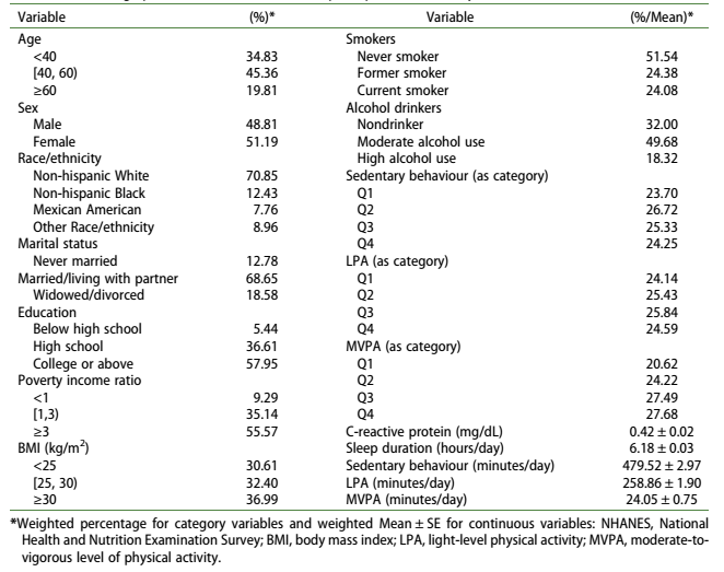 本研究中所有参与者的平均睡眠时间为6.2h,CRP的平均水平为0.42±0.02 mg/dL,平均每天久坐时间为479.52±2.97min。