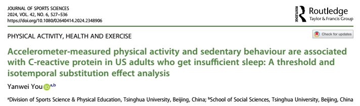 这不就来了!近期,来自清华大学的研究人员在Journal of Sports Sciences杂志上发布了题为“Accelerometer-measured physical activity and sedentary behaviour are associated with C-reactive protein in US adults who get insufficient sleep: A threshold and isotemporal substitution effect analysis”的研究结果[1]。研究表明:适度的中等到剧烈的体力活动(MVPA)(20分钟左右)对减轻睡眠不足引发的炎症有缓解作用。