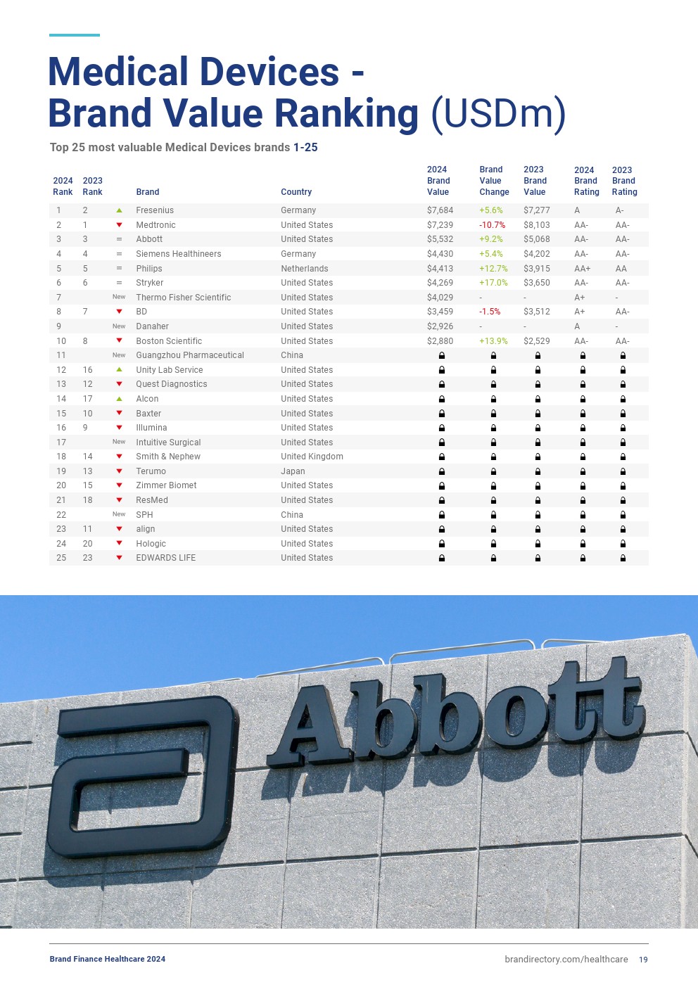 美敦力的品牌价值下降了11%,达到72亿美元,结束了其连续三年蝉联品牌财务医疗器械25强的地位。