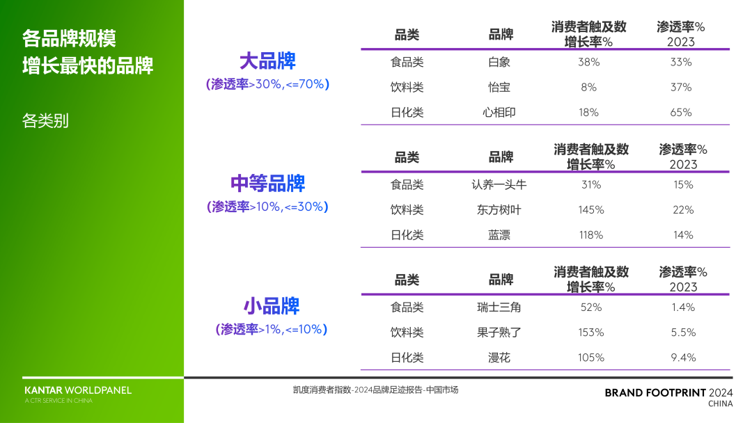 报告也指出,无论品牌规模大小,渗透率提升仍然是品牌获得增长的不二法则。这一点也在各品牌规模增长最快的品牌榜单中得到了印证。